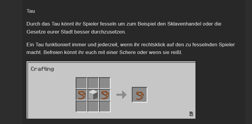 Ebenfalls scheint das Tau-Rezept nicht zu funktionieren vom Schneider oder ich erkenn den mittigen Block nicht. Laut dem Bild Seil-weisse Wolle-Seil? ich hatte kein Ausgangsitem dann.