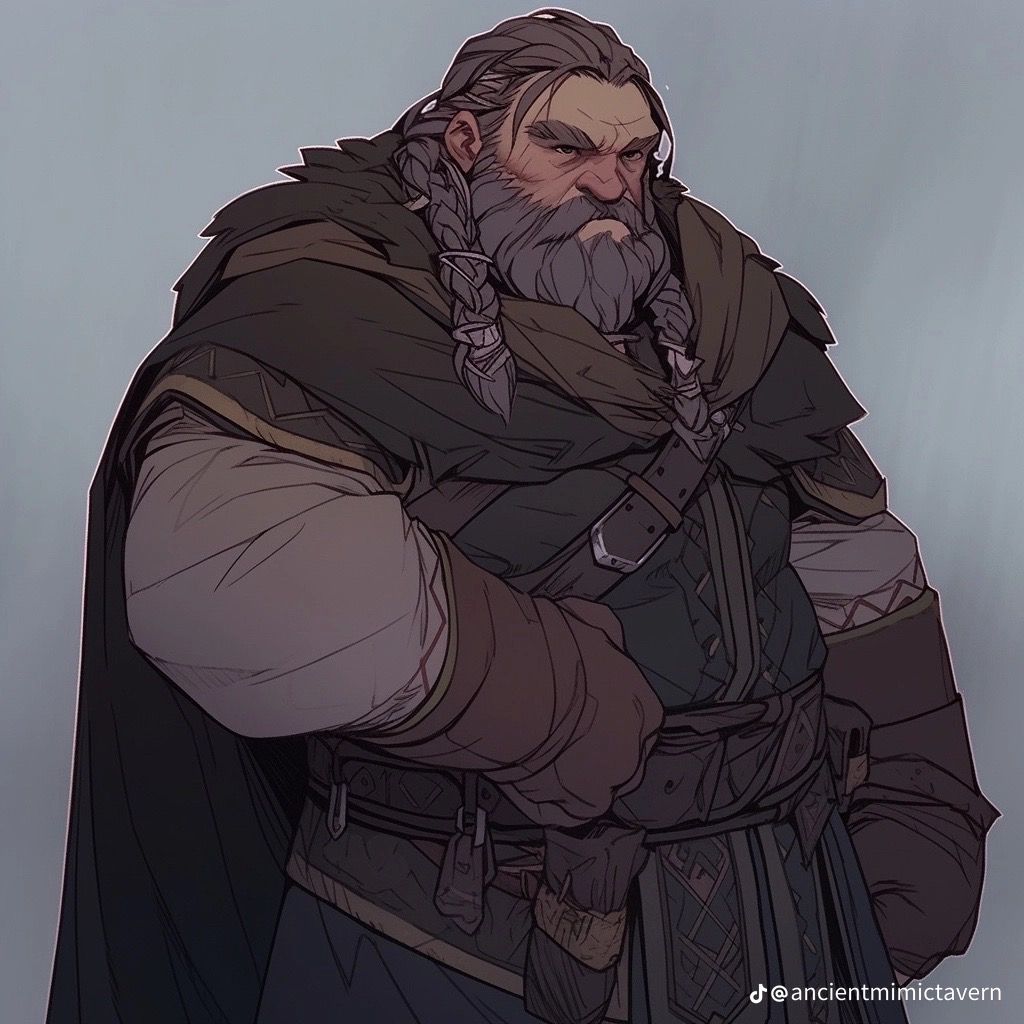 Charaktereigenschaften: Mürrischer Schmiedezwerg mit einem weichen Kern, kann freundlich sein, wenn er will, ist aber eher von der gröberen Sorte, gibt nur sehr wenige Wesen, zu denen er liebevoll und weich ist. Hauptsache er hat zahlende Kundschaft. Nicht so redegewandt zu Frauen, geizig