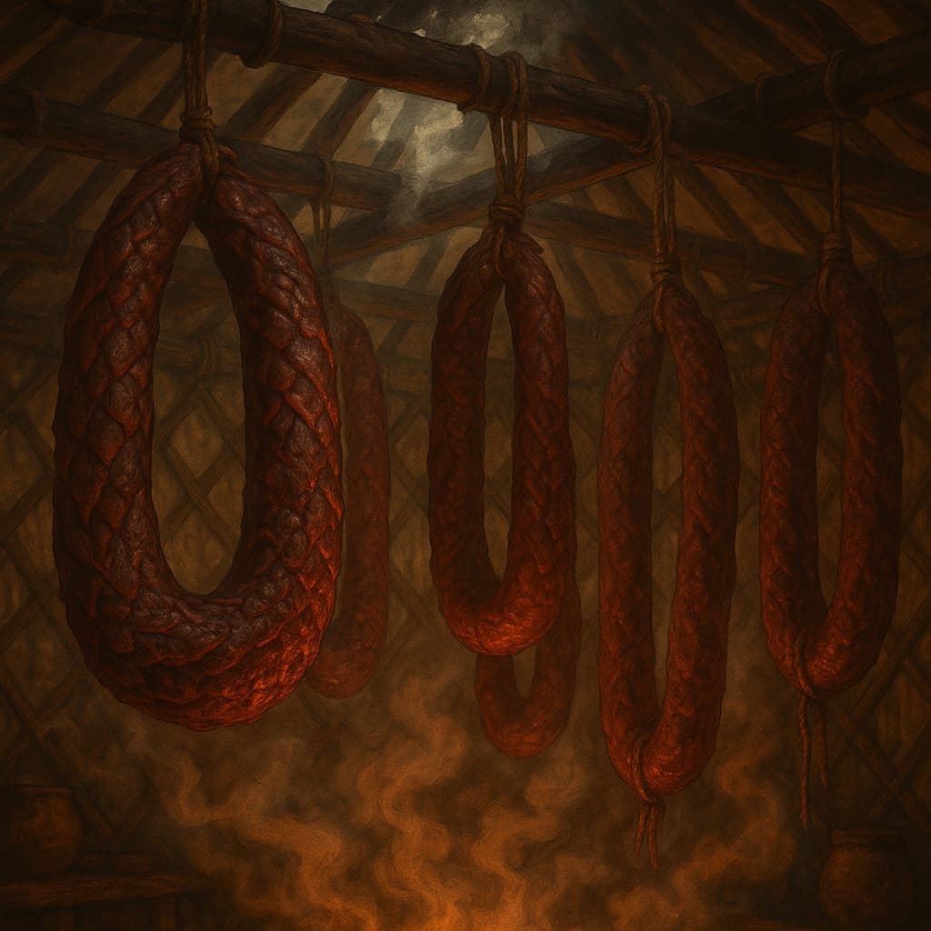 Abschließen binden sie ihre Würste in ihre Zelte um sie zu räuchern. Während der Räucherung fängt die Haut an langsam Muster wie Schuppen zu bilden. Die Attalai sagen. ‚Wenn du die Schuppen siehst, Du die Würste aus dem Yurt ziehst.‘"