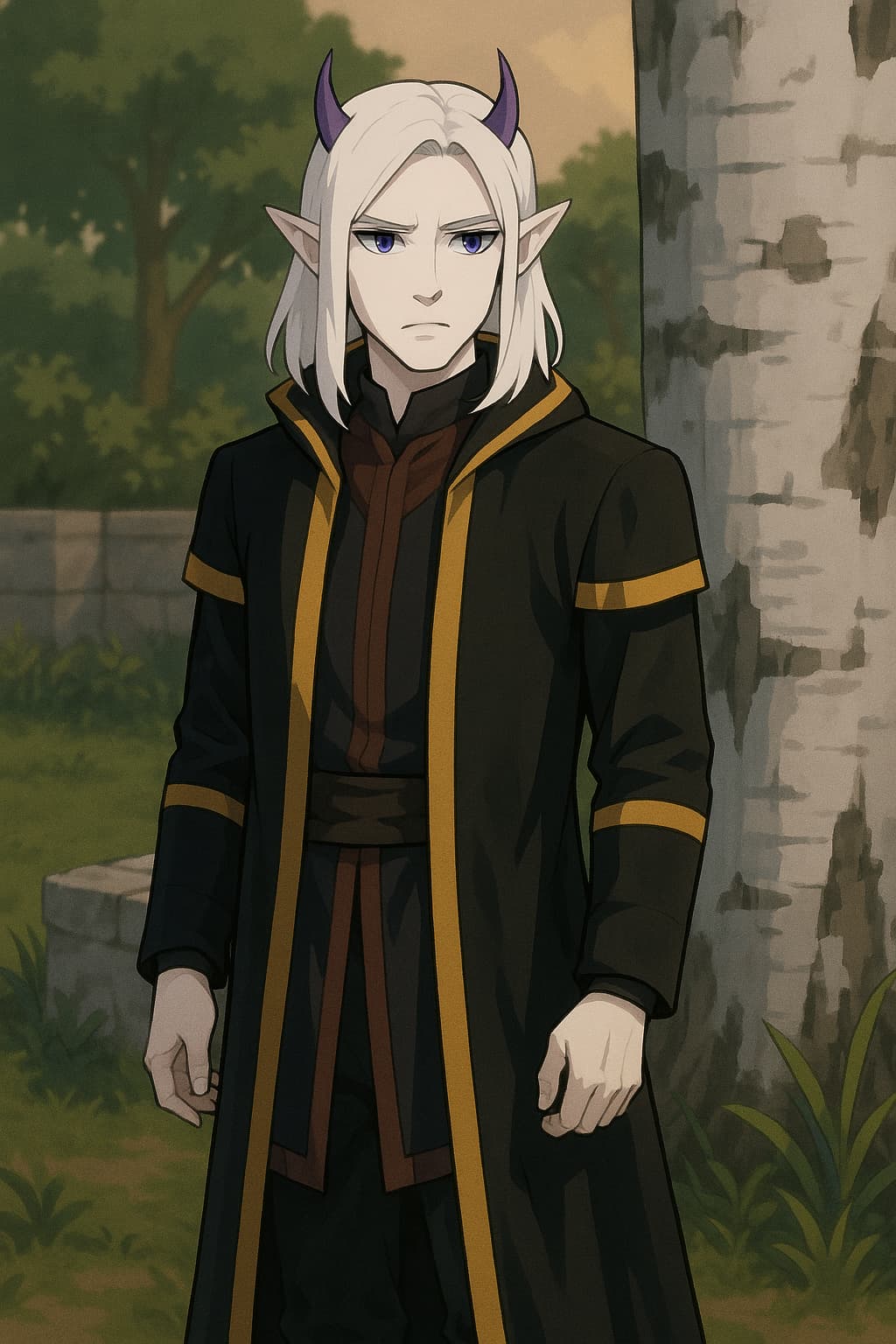 Gesicht & Haare: Sein Gesicht wirkt fast makellos und bleich wie Schnee, mit einer schmalen, aristokratischen Form. Unter einer hohen Stirn fallen lange, glatte, schneeweiße Haare bis über seine Schultern. Die Haare leuchten im Licht beinahe silbern und bilden einen starken Kontrast zu seinen tiefen Augen.