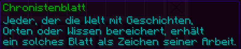 Spieler, die Worldbuilding-Content wie POIs, Gräber, Sabotagespuren, Tavernen, Inseln oder andere besondere Orte einreichen, erhalten dafür eine kleine, aber besondere Anerkennung. Neben – sofern passend – einem Dynmap-Marker für ihren Ort, bekommen sie außerdem ein einzigartiges Custom-Item mit Papiertextur, dem Chronistenblatt.